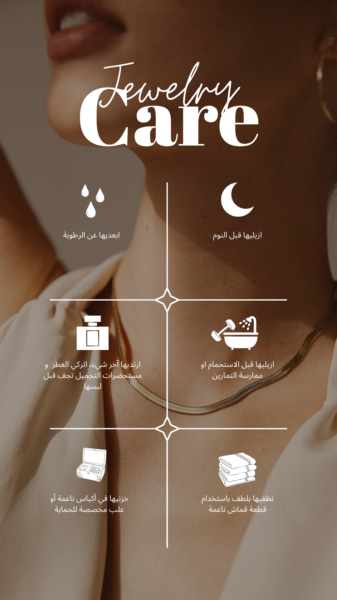 جميع مجوهراتنا مصنوعة من مواد عالية الجودة، ولكن للحفاظ على لمعانها، يرجى اتباع إرشادات العناية الموجودة فالصورة.